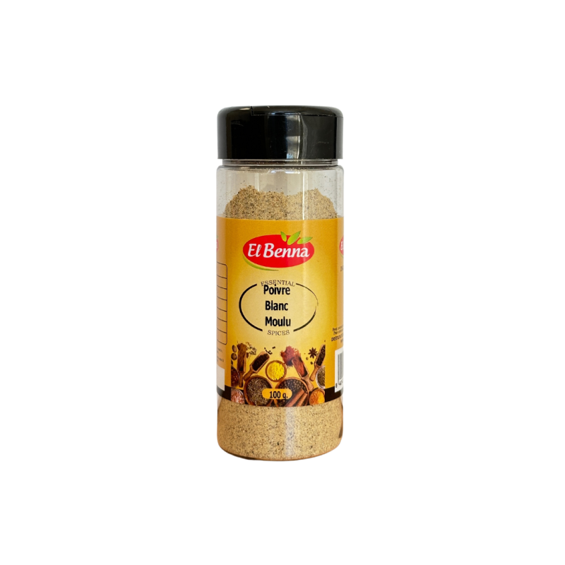 Découvrez le Poivre Blanc Moulu EL BENNA 100gr, parfait pour assaisonner vos recettes. Commandez chez El Benna, votre grossiste alimentaire halal en France.