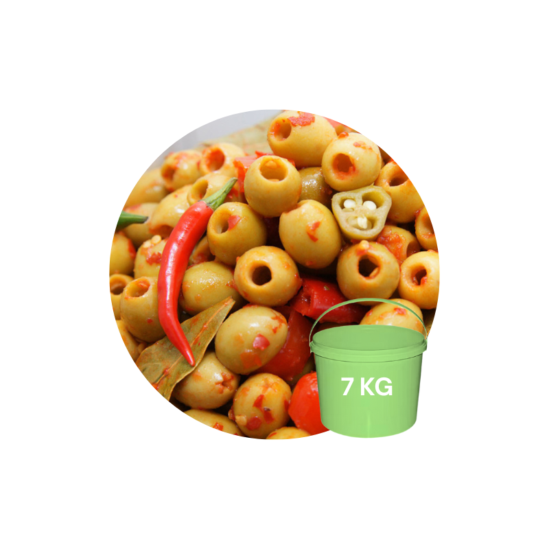 Savourez l'Olive Verte Dénoyautée Piquante 7KG d'El Benna, une olive halal épicée idéale pour vos salades et plats méditerranéens. Commandez chez El Benna, votre grossiste de produits halal.